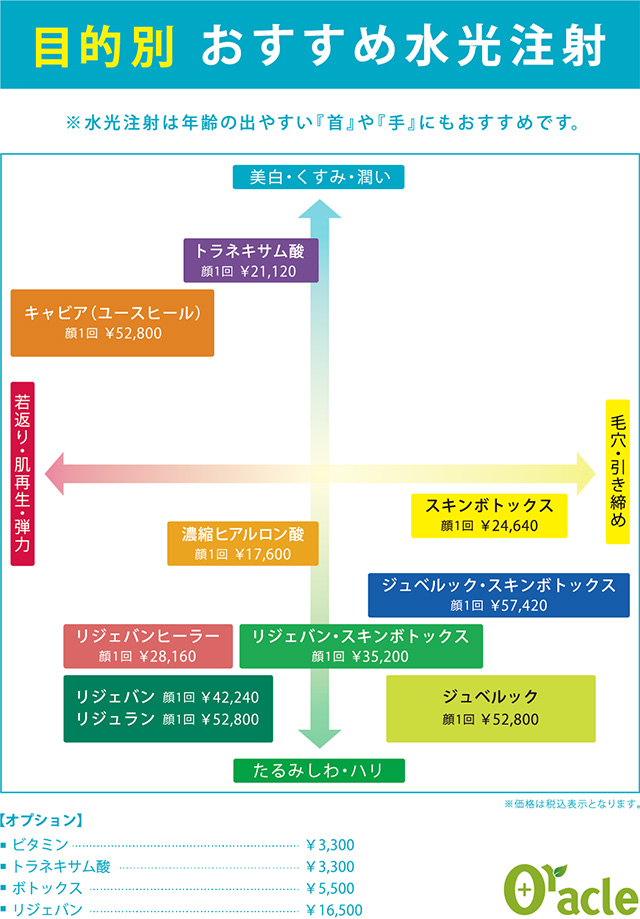 オラクル美容皮膚科では、お肌のタイプやお悩みに合わせて多くの成分を取り扱いしております。