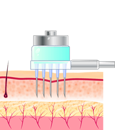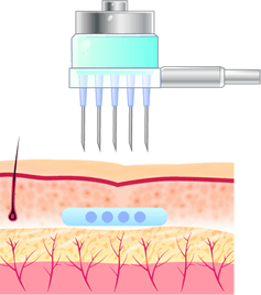 極細針が9本ついた自動注射器で皮膚を吸引しながら治療を行うことで、スピーディーに均一に、ねらった層への薬剤注入が可能となりました。