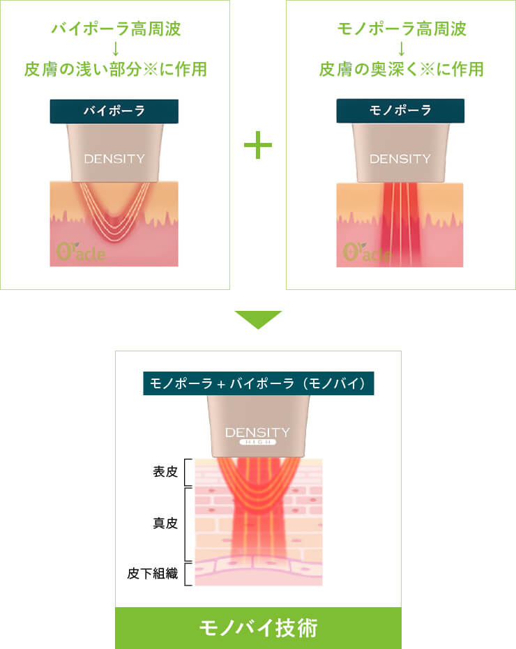 デンシティの最大の特徴であるモノバイ技術により、1回の照射で真皮深層や皮下組織だけでなく、真皮浅層まで一度にアプローチすることが可能となりました。