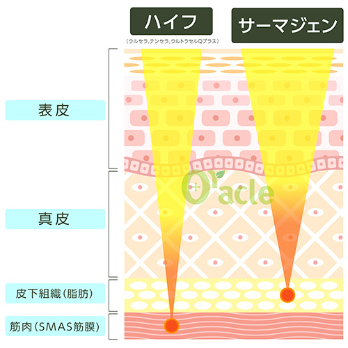 コラーゲンを生成させる脂肪の上層と脂肪層にしっかり熱が入るため、より脂肪燃焼効果が高く、熱の入り方がハイフより広く、さらにしっかり熱が入るため、真皮や脂肪層は広い範囲でサーマジェンでアプローチし、筋肉の層はハイフでアプローチすることで土台から肌表面までをしっかり引締めるメリットがあります。